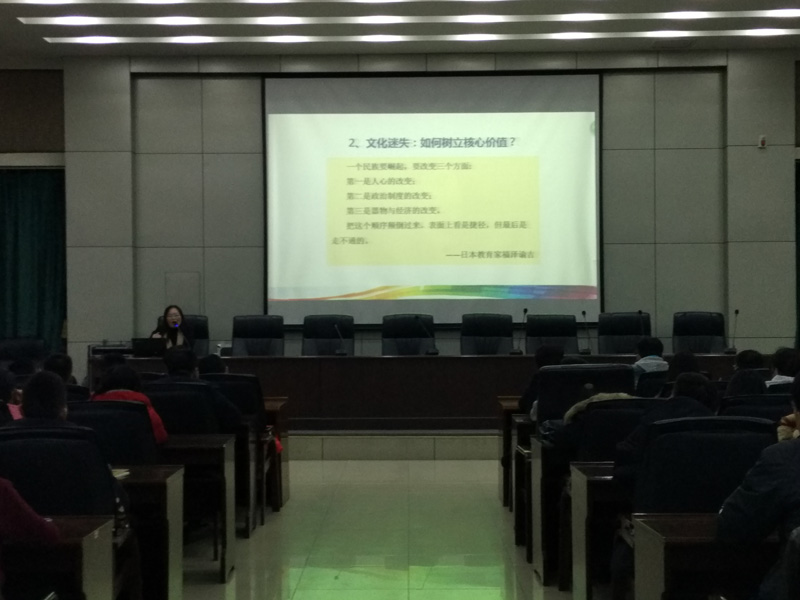 11月7日晚,我院邀请马克思主义学院李英副教授以《习近平总书记的治国理政思想》为主题的专题讲座,学院党委副书记刘会娟出席,365-588、团委、各系团总支书记、学生社团学“习”会全体成员、以及大一新生班委三百余人参加。